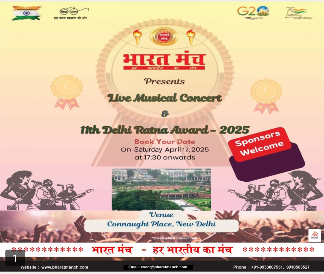 The prestigious organization Bharat Manch Trust, in association with Anmol Moti Mahila Society, is organizing a Baisakhi Celebration Live Music Concert and 11th Delhi Ratna Award ceremony at Palika Park, Connaught Place, New Delhi on April 12, 2025.