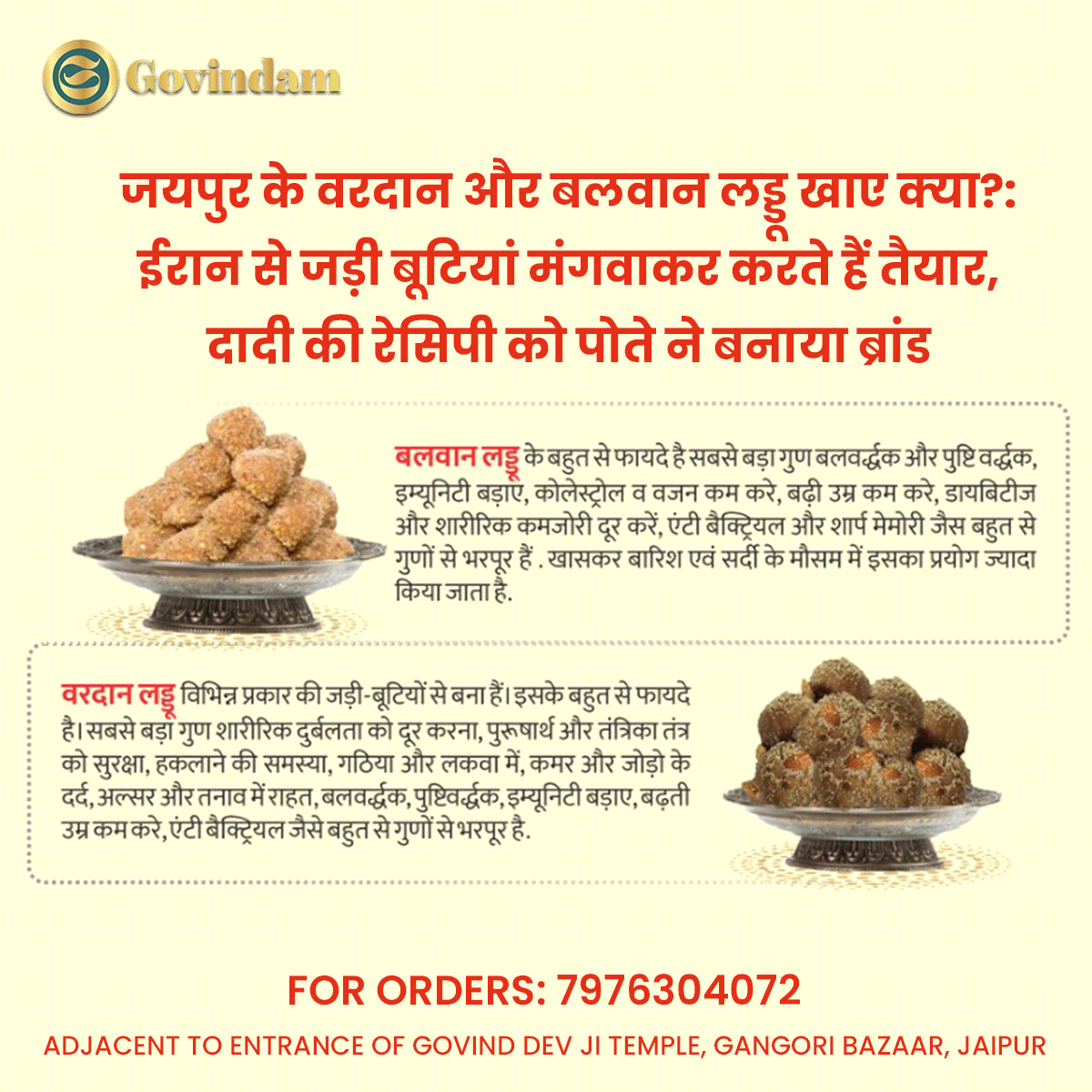 Experience the taste of history and wellness by ordering Balwan and Vardan Laddu from Govindam Sweets. Visit our website or call us at 91-7976304072 to place your order and embark on a journey of flavor and health rooted in ancient Ayurvedic traditions.