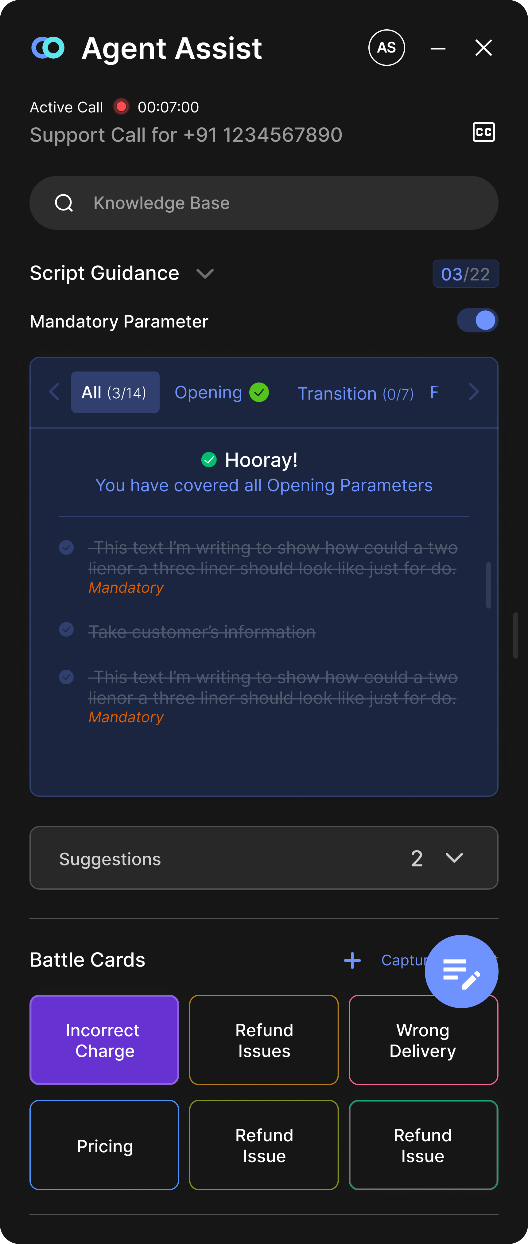 Convin’s Agent Assist effectively addresses challenges such as miscommunication and mis-selling, ensuring compliance and upholding the brand’s reputation for quality and consistency. When agents face tough customer queries or encounter complex objections, this tool empowers agents with guided scripts, actionable suggestions, live captions, and custom prompts on their screens, providing timely guidance and enhancing the overall interaction.