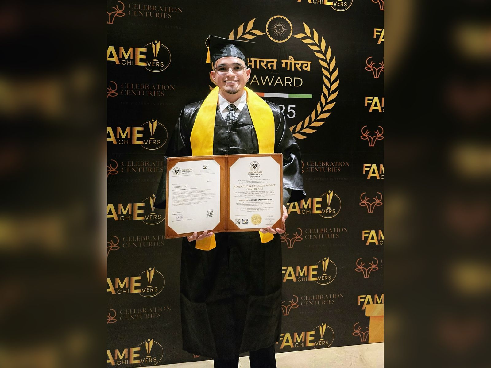 Dr. Robinson Morey Contreras, a globally recognized neuropsychologist, human rights activist, and yoga master, has been awarded three prestigious Honorary Doctorates from leading academic institutions in India. A pioneer in the intersection of mental health, social justice, and holistic healing, Dr. Robinson Morey Contreras has dedicated his life to empowering abuse survivors and advocating for human rights. His contributions, particularly in India, the United States, and Venezuela, have made a significant impact on the fields of psychology, education, and social reform.