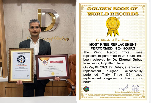 On May 9th, Jaipur’s medical landscape was etched into history as Dr. Dheeraj Dubay, a senior surgeon at Shalby Multispecialty Hospital, achieved an extraordinary milestone in the realm of joint replacement surgery. In an unparalleled feat, Dr. Dubay performed 33 joint replacement surgeries in a single day, setting a new record recognized by prestigious entities such as the Golden Book of World Records, International Book of Records, and Forbes World Records. This monumental achievement underscores Dr. Dubay’s innovative approach and unwavering dedication to advancing surgical care.
