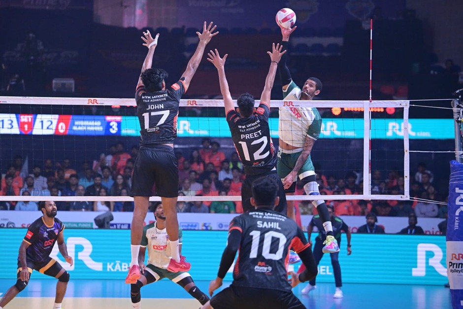 Hyderabad : The Hyderabad Black Hawks halted Bengaluru Torpedoes’ unbeaten march in the RR Kabel Prime Volleyball League powered by Scapia with a pulsating 3–2 victory at the Gachibowli Indoor Stadium on Saturday. In a gripping contest that kept fans on the edge of their seats, the Hawks prevailed 13–15, 15–10, 18–16, 14–16, 15–11. Libero Deepu Venugopal was named the Player of the Match. With this win, Hyderabad moved up to fifth in the points table, collecting 9 points from six matches.