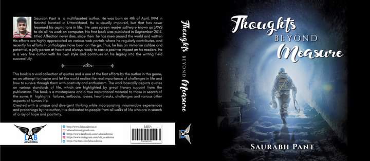 Saurabh Pant is a visually impaired Indian author, born on the 4th of April 1994 in the beautiful hill station of Nainital in Uttarakhand. After having pneumonia at the age of 3 and accepting the loss of vision at age 5, he came in touch with Braille at the age of  12 and had primary education in NIEPVD in Dehradun where he also learnt screen reader access for devices. He returned to inclusion after schooling and graduated from Kirori Mal College in DU where he was a modest student of his time. His writing journey had started to grow in school, but with technical help, he published his 1st work in Sept 2014 and from there onwards he never looked back.