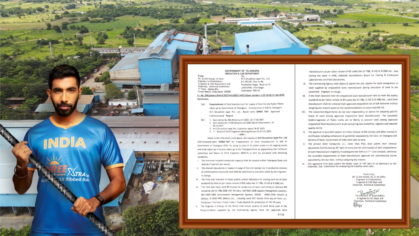 Hyderabad, April 24, 2025: Devashree Ispat Pvt. Ltd. is proud to announce that its flagship brand SHREE TMT—widely recognized as one of the best steel brands in Hyderabad and Telangana—has been officially approved for supply to all public works taken up by the Government of Telangana, including all ongoing and future infrastructure projects.