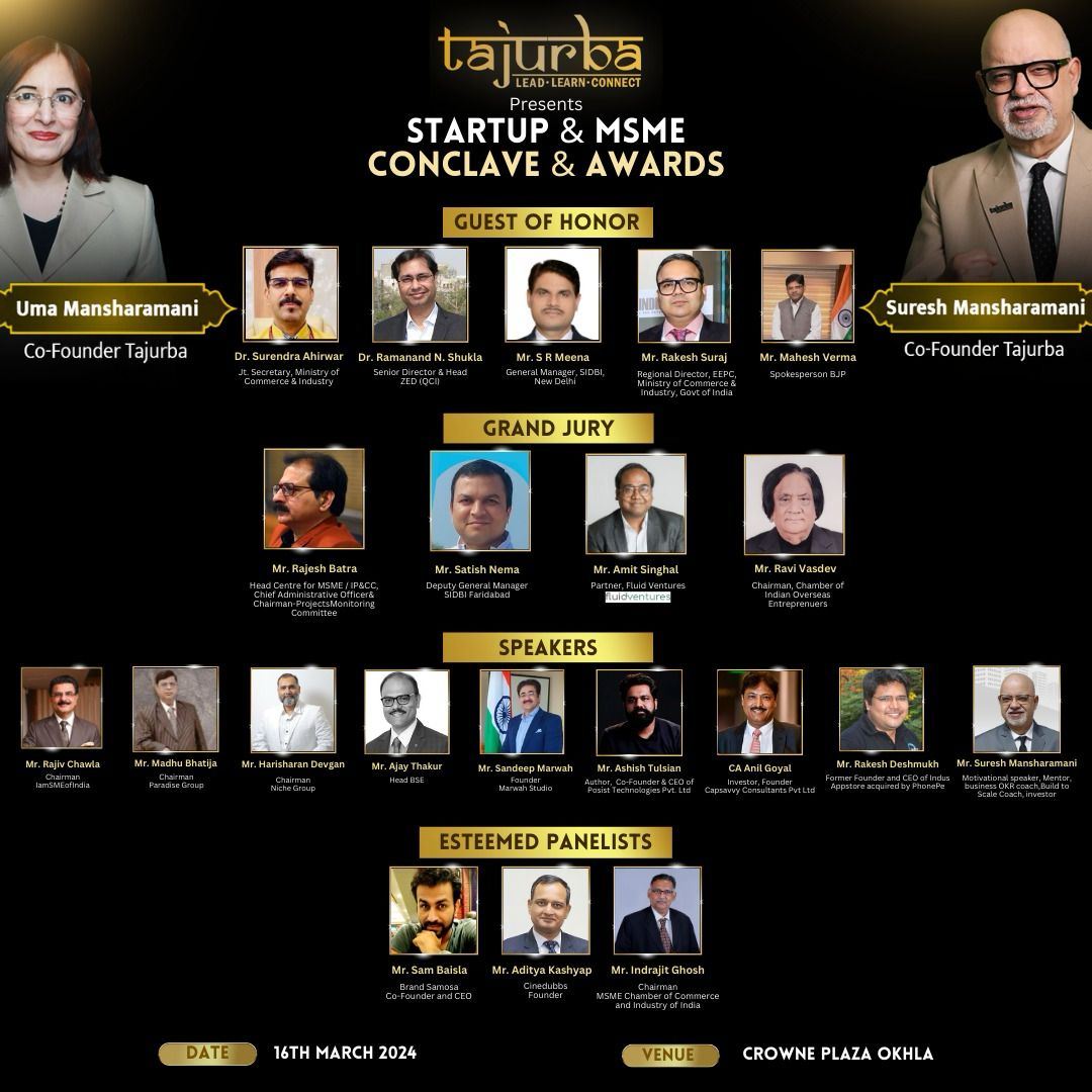 Uma Mansharamani, Co-founder of Tajurba, expresses the significance of the Conclave, stating, “As we host the Tajurba Startup and MSME Conclave Cum Awards, we are thrilled to bring together distinguished speakers from the Ministry of Commerce and Industry, and from SIDBI, besides Industry Experts. This platform not only provides valuable insights on business growth but also addresses the pressing concerns faced by startups and MSMEs. Entrepreneurs will have exclusive networking opportunities, fostering collaborations and partnerships with like-minded individuals. Through interactive sessions and panel discussions, attendees can anticipate a rich reservoir of information on business strategies, innovative ideas, and growth prospects. Through Exhibition Stalls Entrepreneurs can display their products and services to give first hand experience to their prospective clients, visitors and attendees. This conclave represents a significant milestone as we continue to empower businesses, facilitating a collaborative ecosystem for entrepreneurs to thrive and achieve sustained success”.
